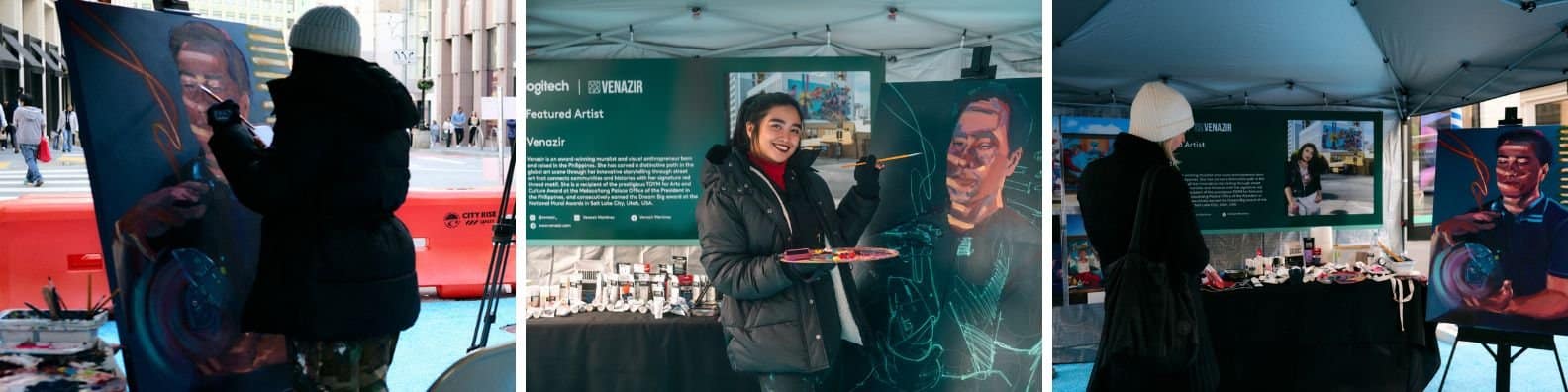 On a crisp winter afternoon in San Francisco, passersby watched as Venazir Martinez (@venazir_), street muralist and visual anthropreneur, transformed a blank canvas into a living mural outside the Logitech Experience Store. The live painting was part of Winter Walk, a holiday celebration in the iconic Union Square that brought people together to connect, create, and interact with the community.