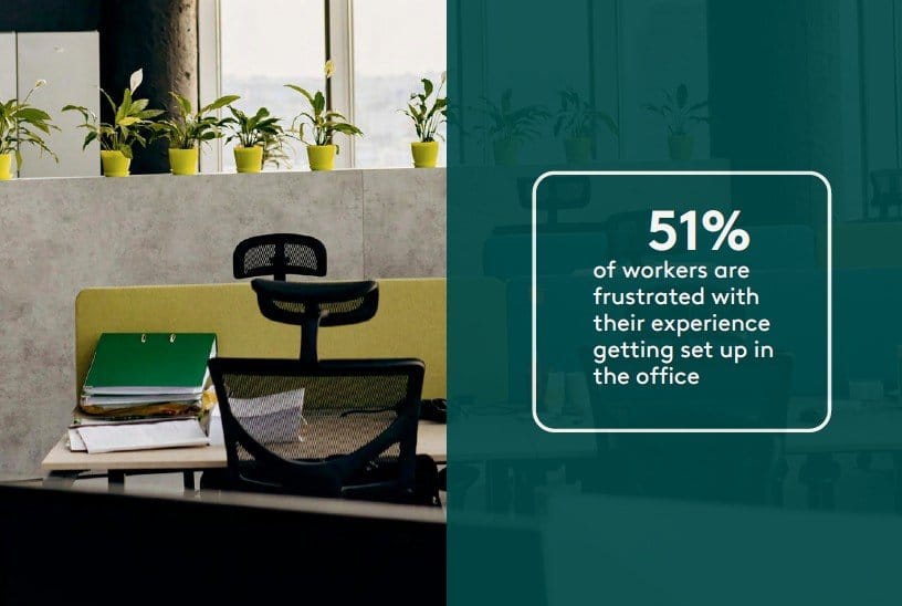 Getting set up in the hybrid office is a hassle: Nearly a third (31 percent) of employees say they’ve had to arrive early to find a good desk, and the average hybrid worker needs at least 25 minutes just to get set up. This includes locating a desk, connecting to Wi-Fi, finding and setting up technology and equipment, and cleaning and organizing their workspace. Employees who say their company doesn’t offer enough workspaces report that it takes them over 40 minutes to get situated.