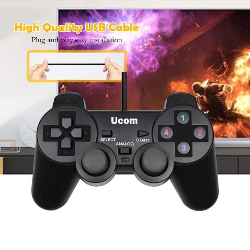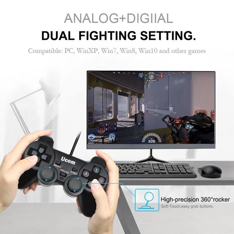 The Ucom PC Controller Game Pads Double Shock Vibration in black offer exceptional performance for gaming. Equipped with essential features, including eight-way digital D-buttons, eight digital fire buttons, and dual shock vibration feedback, this USB joypad ensures an immersive gaming experience. With both turbo and normal modes, it provides versatility for various gaming scenarios. Its comfortable design, familiar button layout, and a 1.8m cord for optimal freedom enhance gameplay. Additionally, the vibration function supports dual shock games, adding realism to your gaming sessions.